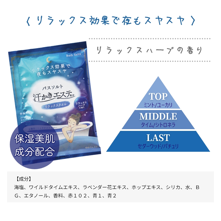 <リラックスナイト>× 2 海塩、ワイルドタイムエキス、ラベンダー花エキス、ホップエキス、シリカ、水、BG、エタノール、香料、赤102、青1、青2
