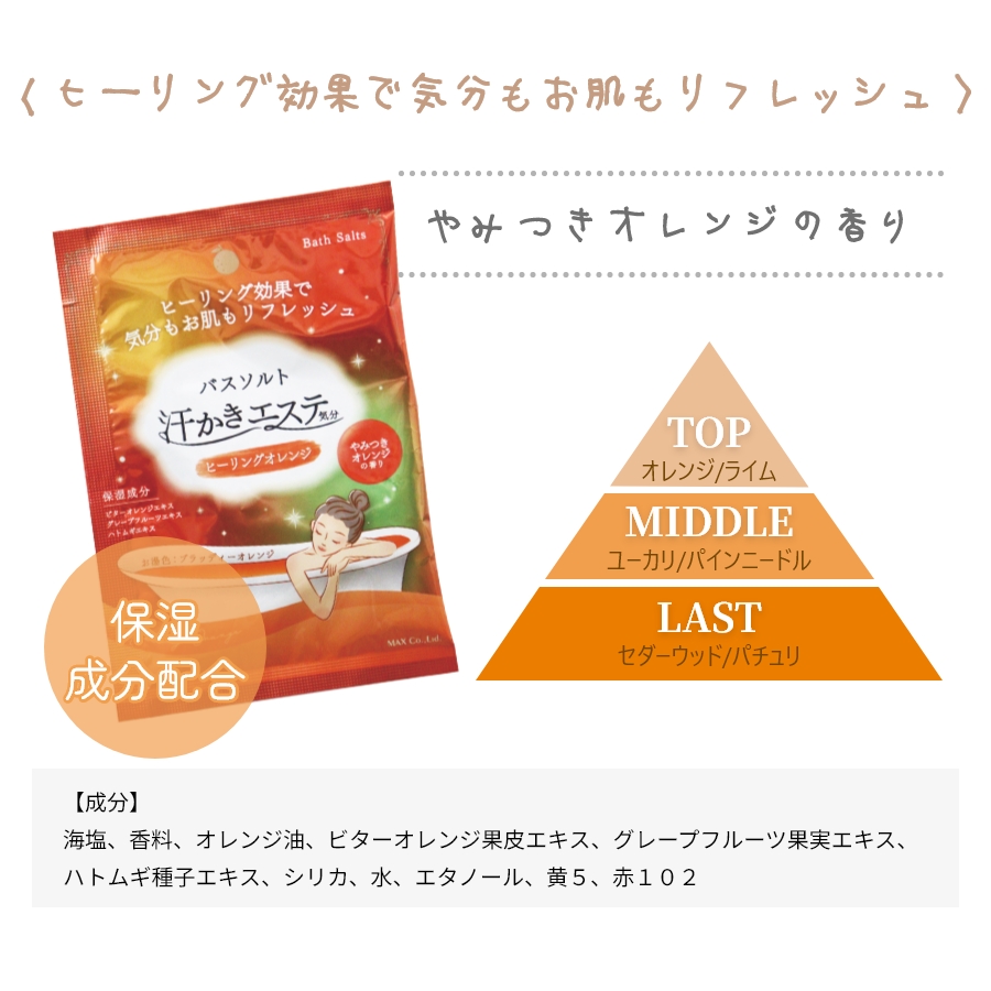 <ヒーリングオレンジ> 海塩、香料、オレンジ油、ビターオレンジ果皮エキス、グレープフルーツ果実エキス、ハトムギ種子エキス、シリカ、水、エタノール、黄5、赤102