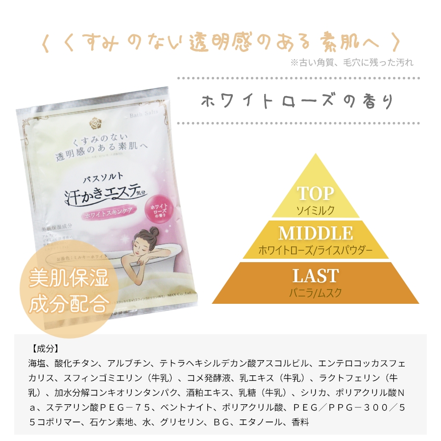 <ホワイトスキンケア>× 2 海塩、酸化チタン、アルブチン、テトラヘキシルデカン酸アスコルビル、エンテロコッカスフェカリス、スフィンゴミエリン(牛乳)、コメ発酵液、乳エキス(牛乳)、ラクトフェリン(牛乳)、加水分解コンキオリンタンパク、酒粕エキス、乳糖(牛乳)、シリカ、ポリアクリル酸Na、ステアリン酸PEG-75、ベントナイト、ポリアクリル酸、PEG/PPG-300/55コポリマー、石ケン素地、水、グリセリン、BG、エタノール、香料