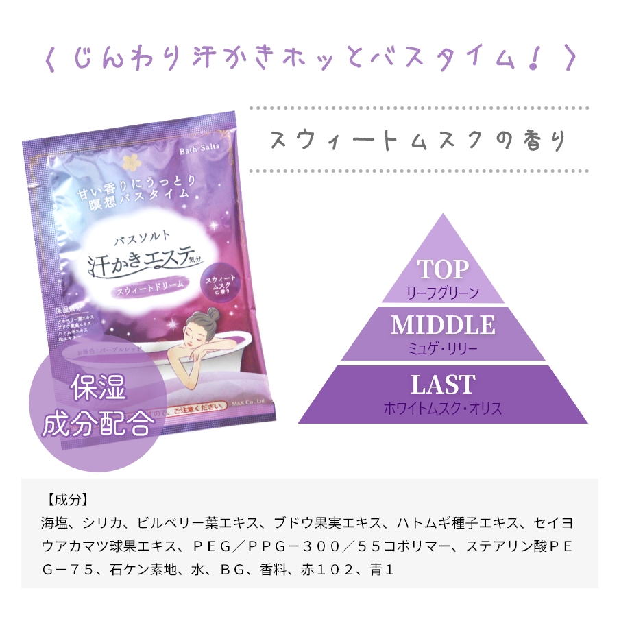<スウィートドリーム>× 2 海塩、シリカ、ビルベリー葉エキス、ブドウ果実エキス、ハトムギ種子エキス、セイヨウアカマツ球果エキス、PEG/PPG-300/55コポリマー、ステアリン酸PEG-75、石ケン素地、水、BG、香料、赤102、青1