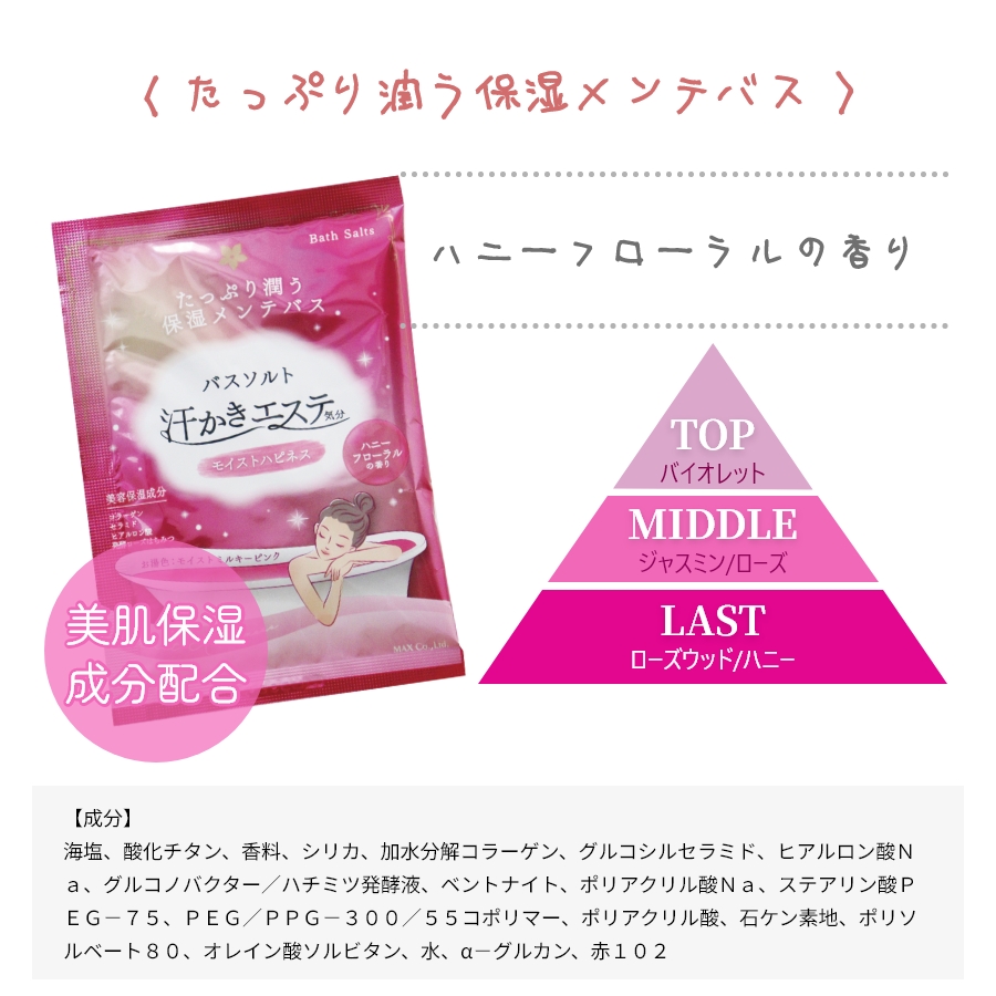 <モイストハピネス> 海塩、酸化チタン、香料、シリカ、加水分解コラーゲン、グルコシルセラミド、ヒアルロン酸Na、グルコノバクター/ハチミツ発酵液、ベントナイト、ポリアクリル酸Na、ステアリン酸PEG-75、PEG/PPG-300/55コポリマー、ポリアクリル酸、石ケン素地、ポリソルベート80、オレイン酸ソルビタン、水、α-グルカン、赤102 |