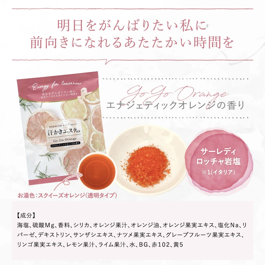 <Go Go Orange> 海塩、硫酸Mg、香料、シリカ、オレンジ果汁、オレンジ油、オレンジ果実エキス、塩化Na、リパーゼ、デキストリン、サンザシエキス、ナツメ果実エキス、グレープフルーツ果実エキス、リンゴ果実エキス、レモン果汁、ライム果汁、水、BG、赤102、黄5