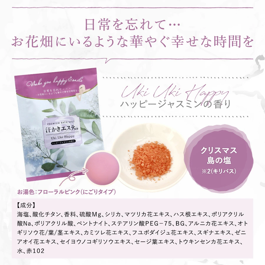 <Uki Uki Happy> 海塩、酸化チタン、香料、硫酸Mg、シリカ、マツリカ花エキス、ハス根エキス、ポリアクリル酸Na、ポリアクリル酸、ベントナイト、ステアリン酸PEG-75、BG、アルニカ花エキス、オトギリソウ花/葉/茎エキス、カミツレ花エキス、フユボダイジュ花エキス、スギナエキス、ゼニアオイ花エキス、セイヨウノコギリソウエキス、セージ葉エキス、トウキンセンカ花エキス、水、赤102