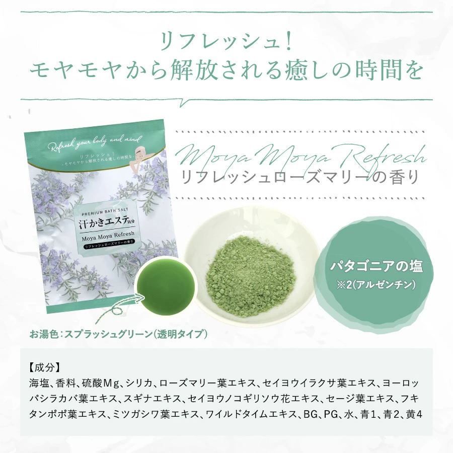 <Moya Moya Refresh> 海塩、香料、硫酸Mg、シリカ、ローズマリー葉エキス、セイヨウイラクサ葉エキス、ヨーロッパシラカバ葉エキス、スギナエキス、セイヨウノコギリソウ花エキス、セージ葉エキス、フキタンポポ葉エキス、ミツガシワ葉エキス、ワイルドタイムエキス、BG、PG、水、青1、青2、黄4