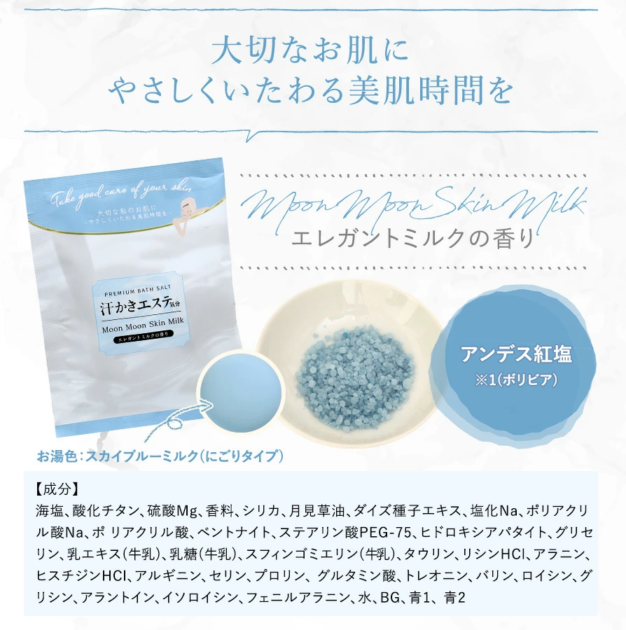 <Moon Moon Skin Milk> 海塩、酸化チタン、硫酸Mg、香料、シリカ、月見草油、ダイズ種子エキス、塩化Na、ポリアクリル酸Na、ポリアクリル酸、ベントナイト、ステアリン酸PEG-75、ヒドロキシアパタイト、グリセリン、乳エキス(牛乳)、乳糖(牛乳)、スフィンゴミエリン(牛乳)、タウリン、リシンHCl、アラニン、ヒスチジンHCl、アルギニン、セリン、プロリン、グルタミン酸、トレオニン、バリン、ロイシン、グリシン、アラントイン、イソロイシン、フェニルアラニン、水、BG、青1、青2