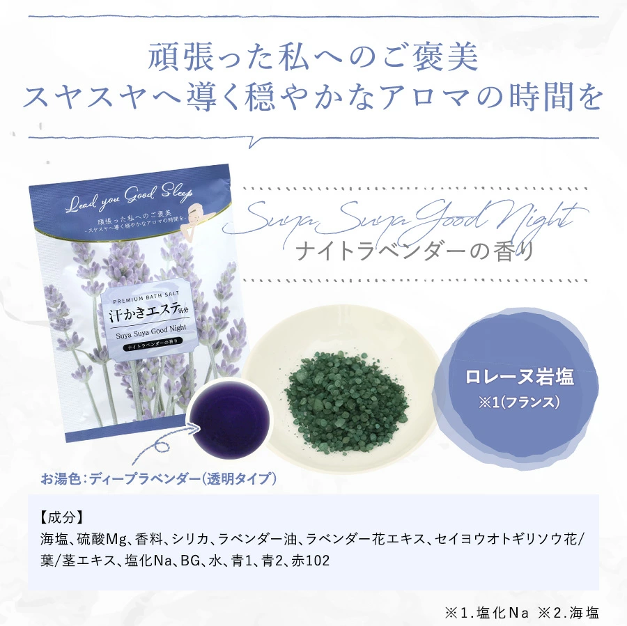 <Suya Suya Good Night> 海塩、硫酸Mg、香料、シリカ、ラベンダー油、ラベンダー花エキス、セイヨウオトギリソウ花/葉/茎エキス、塩化Na、BG、水、青1、青2、赤102 |