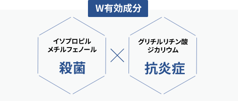 - 殺菌有効成分「イソプロピルメチルフェノール」と抗炎症有効成分「グリチルリチン酸ジカリウム」のダブル有効成分でニキビを予防