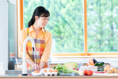キッチンで夕飯の準備中に少し音量を上げたい時、濡れた手でも大丈夫な防水対応のリモコンなら安心。