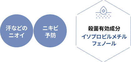 殺菌有効成分「イソプロピルメチルフェノール」が肌に付着した菌を殺菌。汗などのニオイやニキビを予防します。