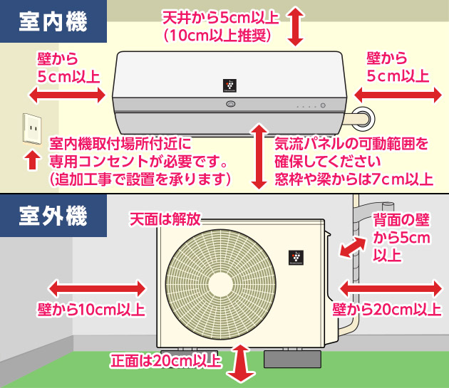 - エアコンは、室内機・室外機のサイズに加えて、周囲の設置スペースに充分な余裕が必要です。