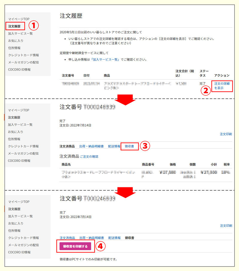 以下のURLで、「ご注文番号」「ご注文者様の姓」「ご注文時のメールアドレス もしくは ご注文者郵便番号」を入力して注文情報を表示し、「領収書」画面から「領収書を印刷する」が可能です。 https://cocorostore.jp.sharp/sales/guest/form ※特別なセール向けサイトのものは表示されません。