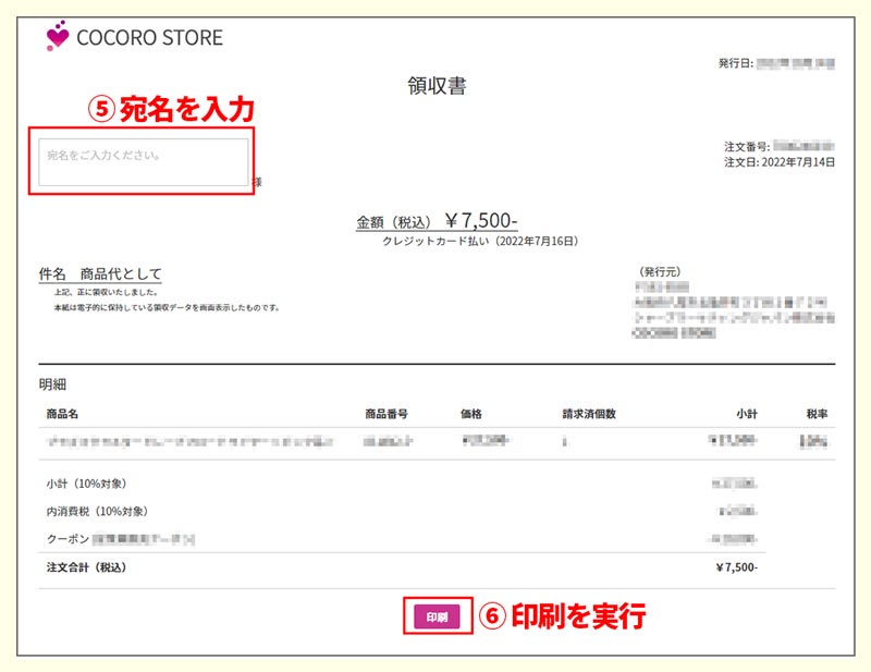 ※ご利用のPC/ブラウザ環境によって宛名のレイアウトが異なる場合があります。 ※2回目は「再発行」の表示が追加されます。 ※「クレジットカード払い」または「PayPay」で領収書の発行ができない、もしくは、Web領収書の印刷を2回失敗した場合は、お問い合わせ窓口までお問い合わせください。