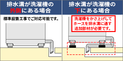 排水溝が洗濯機の真下にある場合、排水ホースを本体の下に通す必要があるため、本体かさ上げ用部材(有料)が必要です。
